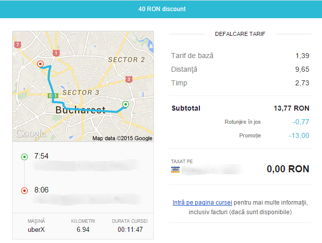 În prezent, prima cursă cu Uber este gratuită, în limita a 40 de lei. Nu trebuie decât să-ți faci cont pe Uber și apoi poți testa serviciul fără a plăti nimic.